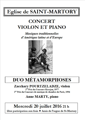 Le Duo Métamorphoses, composé de Zacchary Pourtzeladze au violon et de Anne Marty au piano, interprète des airs traditionnels d’Amérique Latine et d’Europe. Le concert, organisé par l’association Des Amis De L’orgue De Saint-Martory, a été enregistré le 20 juillet 2016 en l’église de Saint-Martory (31).